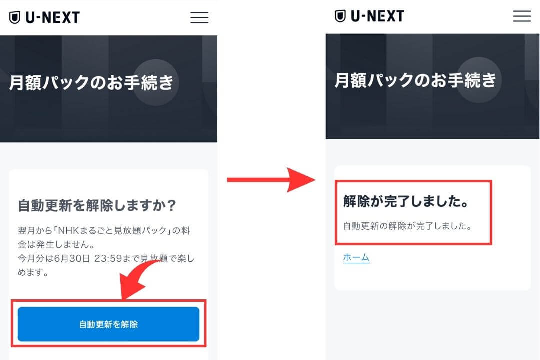 また、U-NEXTの月額見放題を解約したとしても、NHKパックの自動更新だけが生き残ってしまう場合があります。