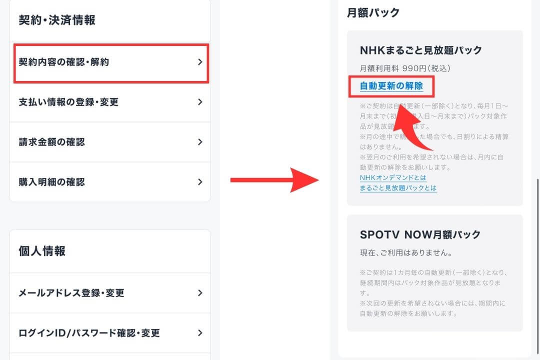 メニューの「アカウント・契約」から「契約内容の確認・解約」へと進み、NHKパックの状態が「自動更新中」になっていないかを確認しましょう。